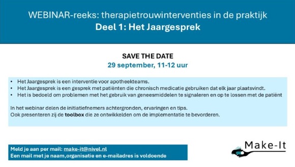 Op 29 september is er een webinar over het Jaargesprek georganiseerd door het Make-It consortium i.s.m. de apothekers die het Jaargesprek initieerden. Uitleg over het jaargesprek en praktische tips. Voor apothekers, apothekersassistenten, farmaceutisch consulenten en farmakundigen.
