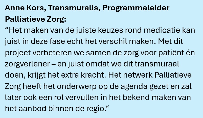 Patiënten in de palliatieve fase gebruiken vaak veel medicijnen: gemiddeld tien verschillende geneesmiddelen in het laatste levensjaar, waarvan een aanzienlijk deel geen klinische meerwaarde meer heeft. Dit vergroot de medicatielast en kan leiden tot onnodige bijwerkingen. Met het project “Minderen en stoppen van medicatie in de palliatieve fase” in regio Zuid-Holland Noord richten we ons met huisartsen, apothekers en thuiszorg op het tijdig evalueren en waar mogelijk het verminderen van medicatie.